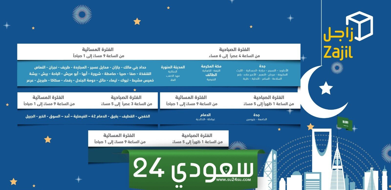 | حداد بني مالك – جازان – محايل عسير – المجاردة – طريف – نجران – النماص – القنفذة – الصفا – صبيا صامطة – شرورة – أبها – أبو عريش – الباحة – بيش – بيشة – خميس مشيط – تبوك تيماء – حائل – دومة الجندل – رفحاء – سكاكا – طبرجل – عرعر | من الساعة 16:00 مساءا إلى الساعة 18:00 مساءا | من الساعة 21:00 ظهراً حتى الساعة 1:00 بعد منتصف الليل |