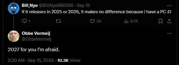 سأل أحد المستخدمين Vermeij عن إصدار اللعبة على الكمبيوتر الشخصي، فأجاب أنه سيتعين على لاعبي الكمبيوتر الشخصي الانتظار حتى عام 2027. ونأمل أن يكون مجرد مزاح، ولكن إذا تم تأجيل اللعبة بالفعل إلى عام 2026، فمن المحتم أن يحدث ذلك.