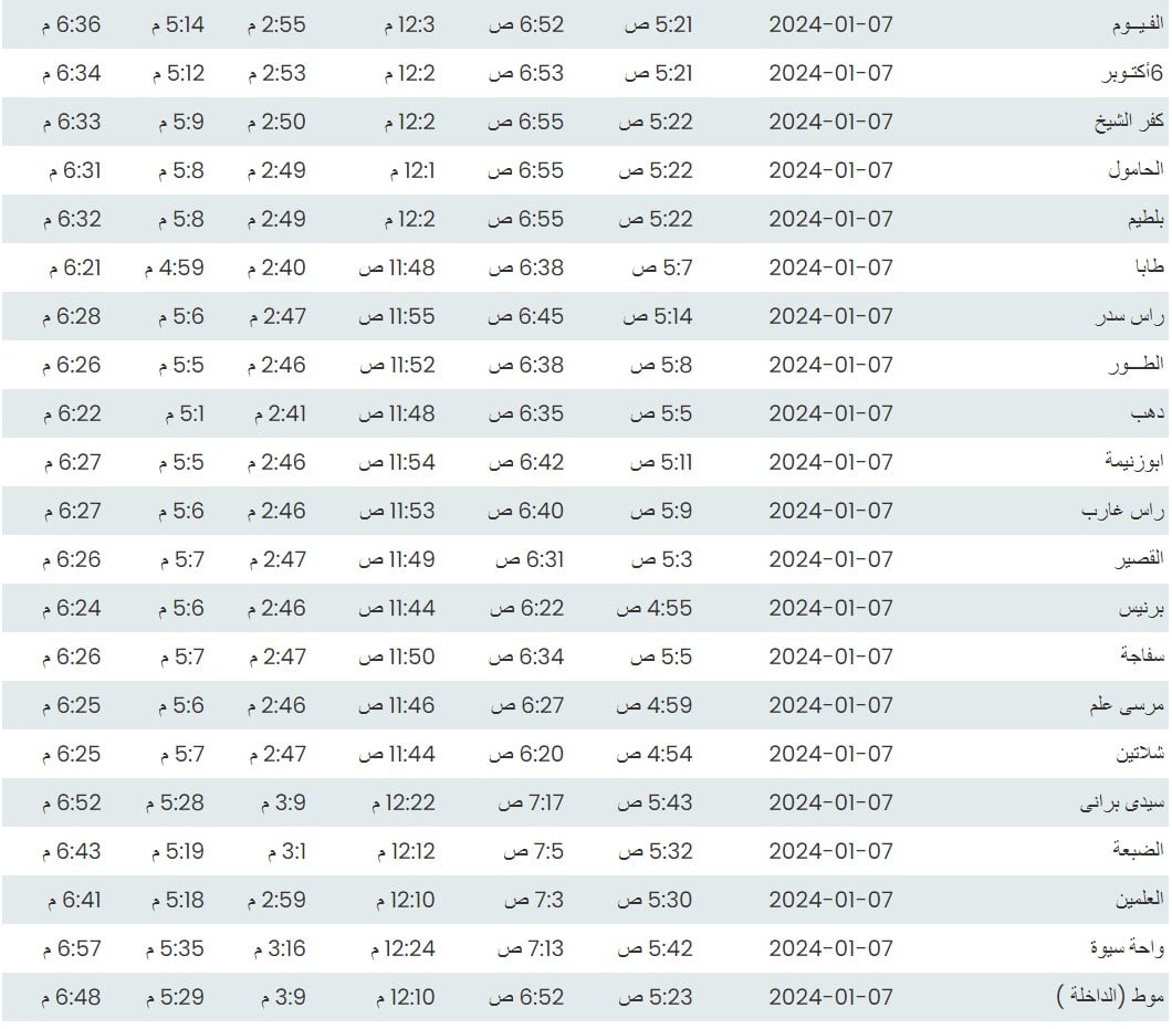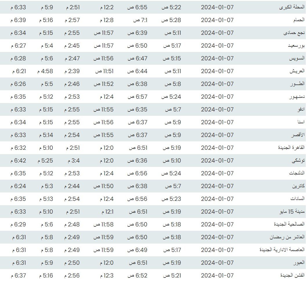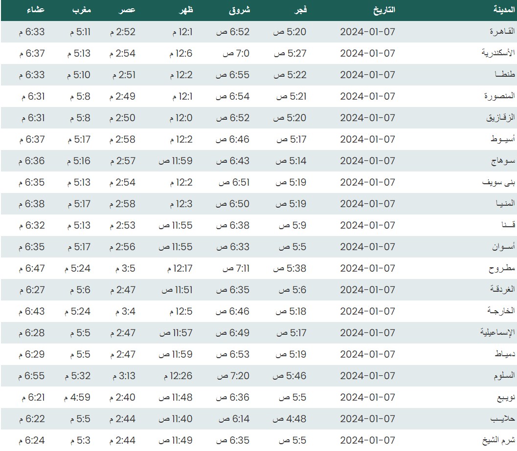 وفيما يلي أوقات الصلاة لعدد من مدن ومحافظات الجمهورية بناء على بيانات الهيئة العامة للمساحة
