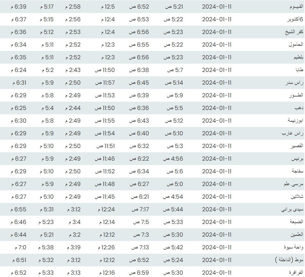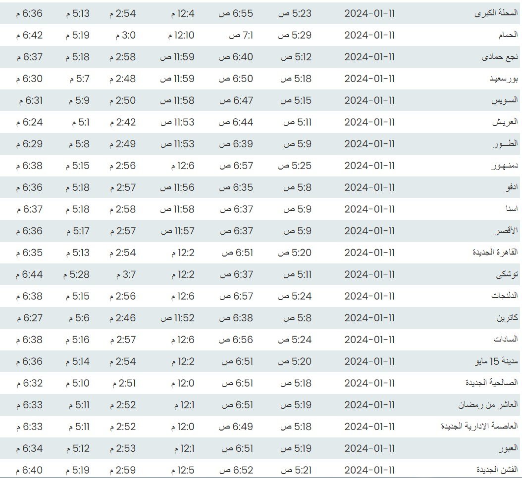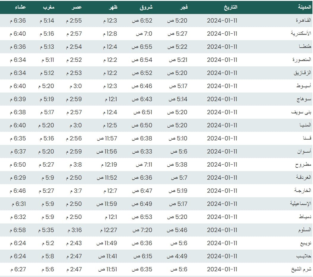 وفيما يلي أوقات الصلاة لعدد من مدن ومحافظات الجمهورية بناء على بيانات الهيئة العامة للمساحة