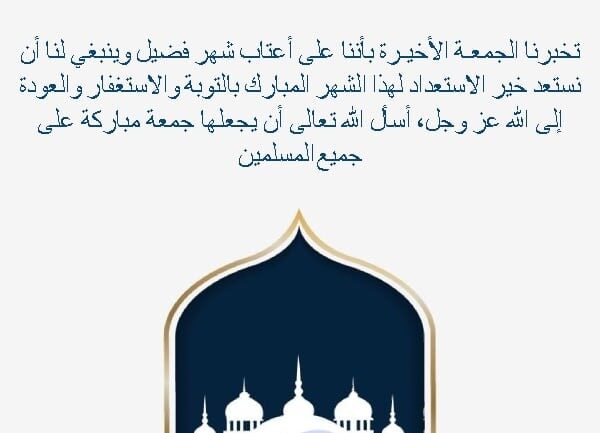 | The last Friday tells us that we are on the cusp of a holy month, and we should prepare well for this blessed month by repenting, seeking forgiveness, and returning to God Almighty. I ask God Almighty to make it a blessed Friday for all Muslims. | تخبرنا الجمعـة الأخيـرة بأننا على أعتاب شهر فضيل وينبغي لنا أن نستعد خير الاستعداد لهذا الشهر المبارك بالتوبة والاستغفار والعودة إلى الله عز وجل، أسأل الله تعالى أن يجعلها جمعة مباركة على جميع المسلمين. |